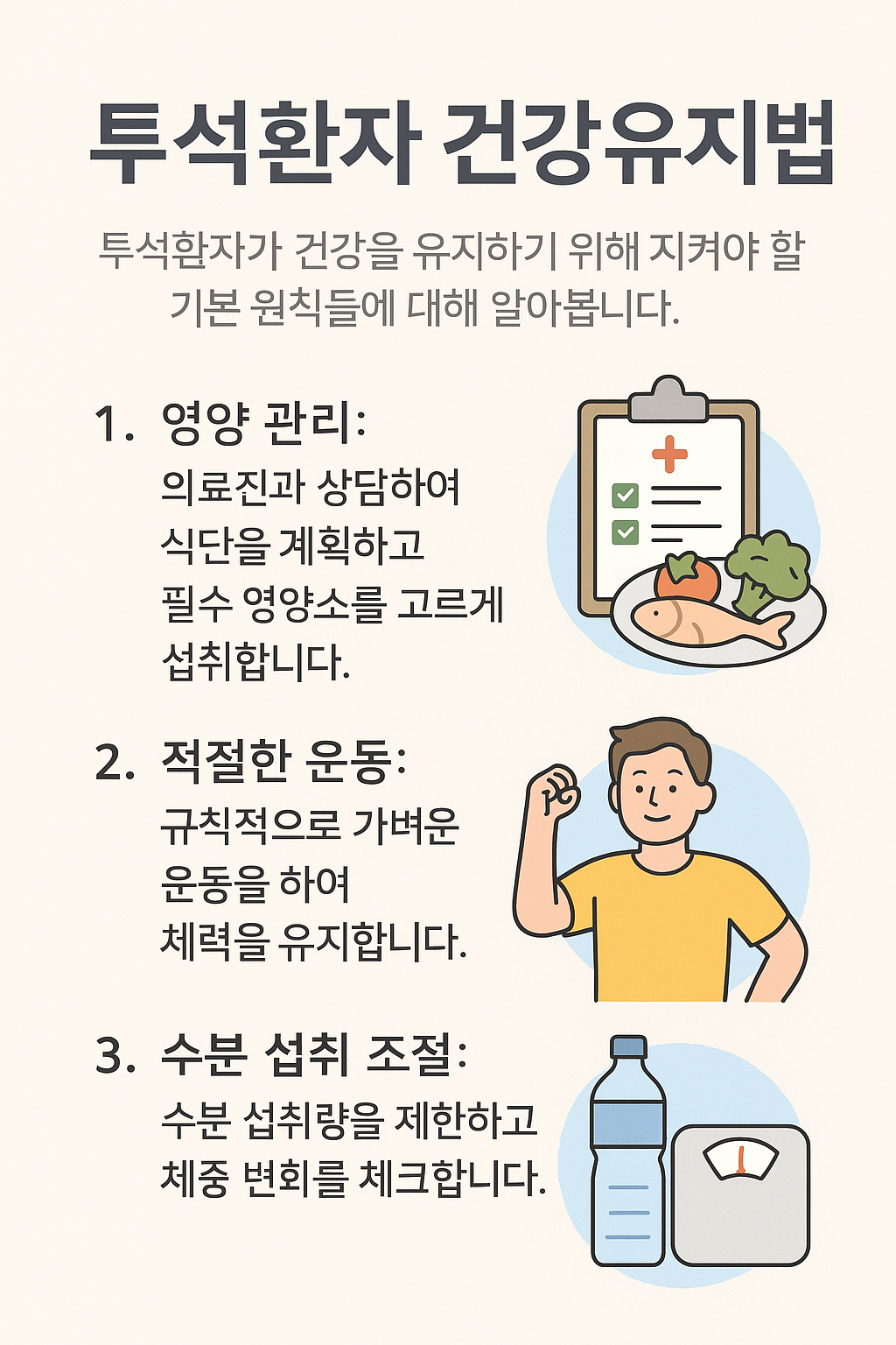 “운동하면 안 되는 거 아닌가요?”, “물을 정말 하루에 한 컵도 안 마셔야 하나요?” 이런 질문은 투석 환자라면 누구나 가질 수 있는 고민입니다. 하지만 정답은 늘 ‘균형과 이해’에 있습니다. 스스로의 몸을 가장 잘 아는 존재가 되는 것이, 진짜 치료의 시작입니다.